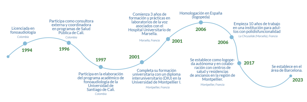 Graduada en Fonoaudiología en 1994 por la Universidad Católica de Manizales (Colombia). Título homologado en España por el Ministerio de Educación y Ciencias y en Francia por el Service de Certifications Paramédiques et Sociales.